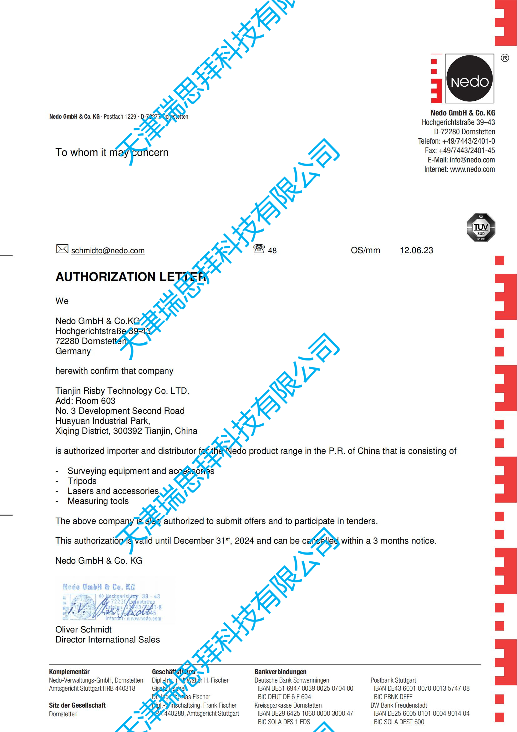 天津瑞思拜科技有限公司為德國NEDO中國區(qū)域代理商,如有需要請直接與我們?nèi)〉寐?lián)系。